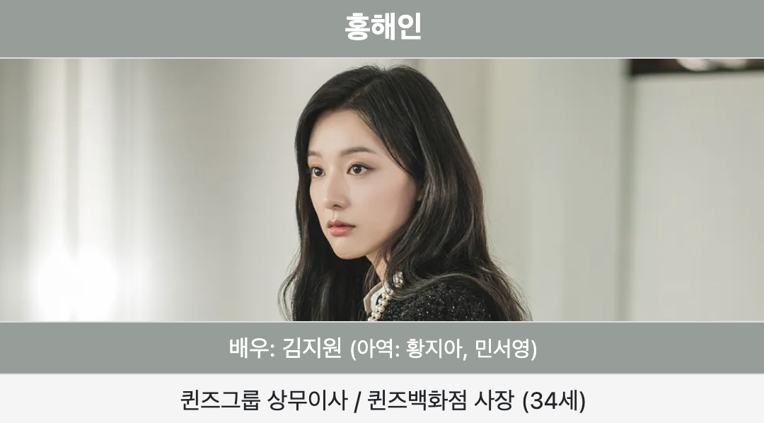 - 홍해인: 재벌 3세대 퀸즈그룹 상속녀로, 백현우와 결혼을 앞두고 있는 인물입니다.