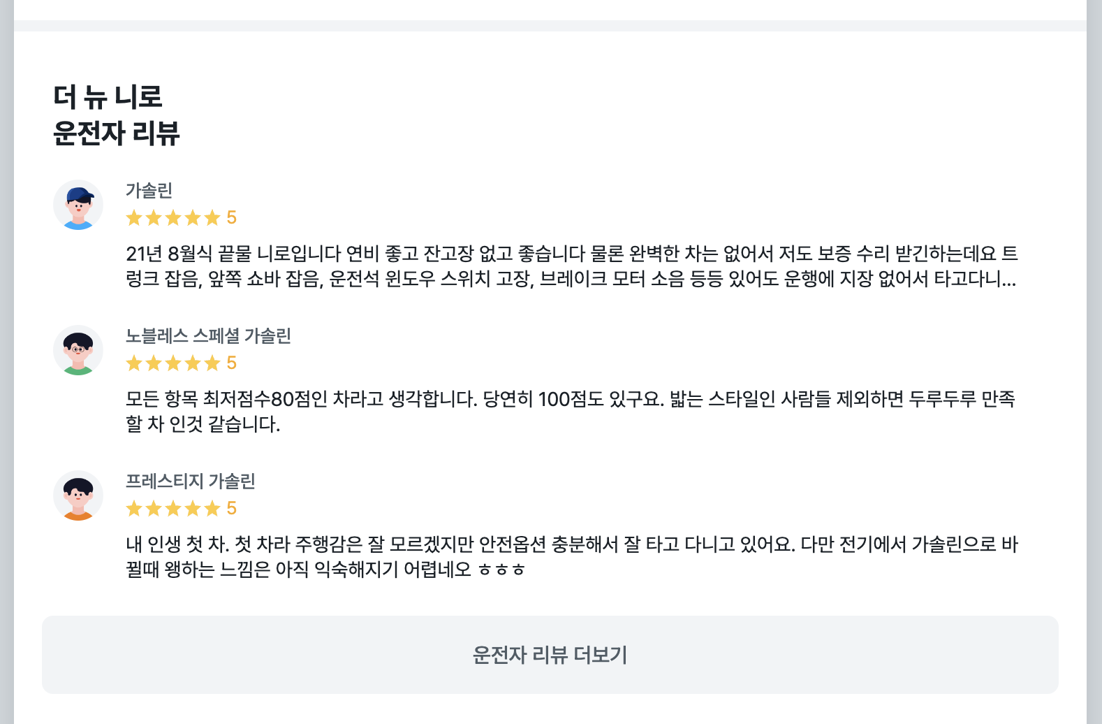 | 트렌드 | 기본적인 안전 및 편의 사양 제공. 전면 유리에만 적용된 이중 차음 유리가 특징. | 24,390,000원 |