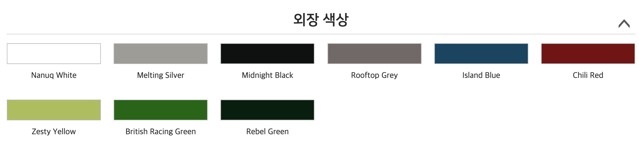 | Colour Options | 나누크 화이트, 브리티쉬레이싱 그린, 멜팅 실버, 아일랜드 블루, 루프탑 그레이, 제스티 옐로우, 미드나잇 블랙, 칠리 레드 |