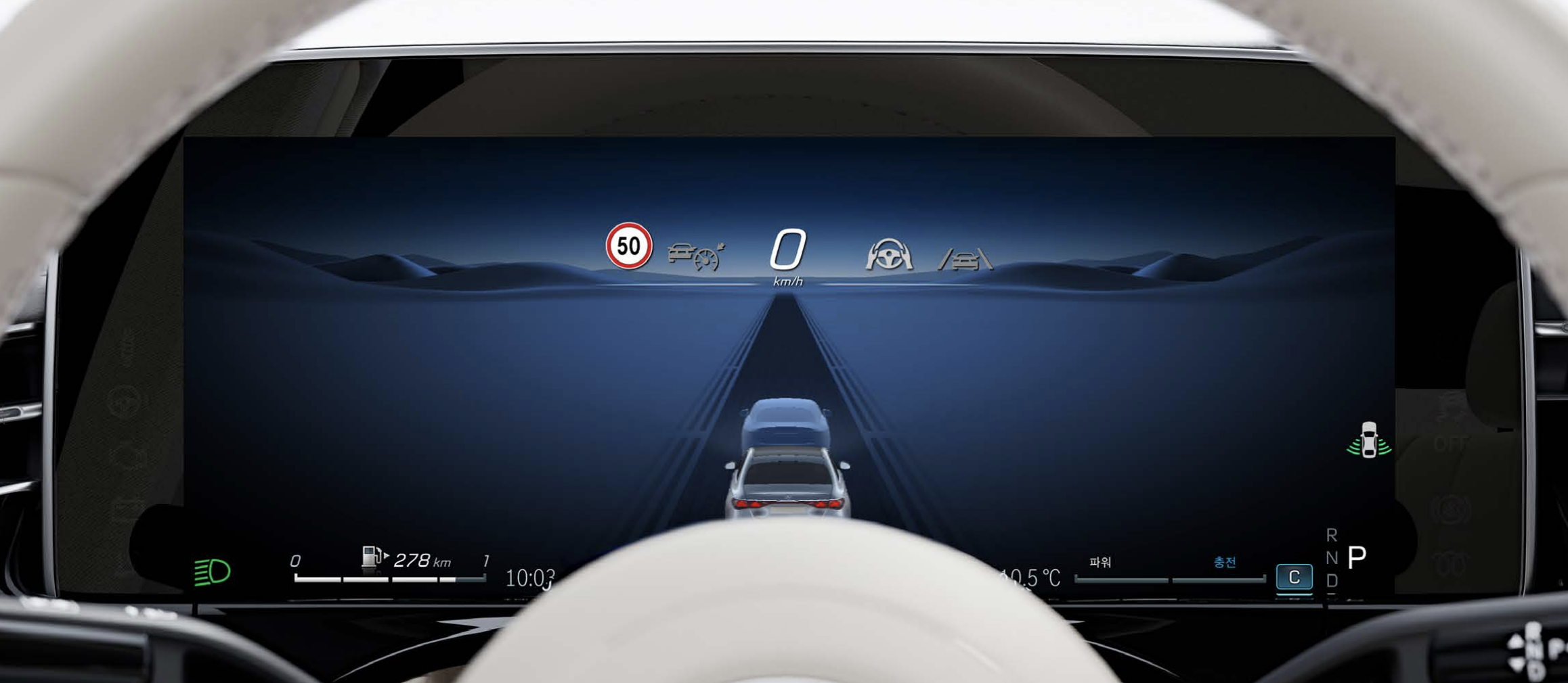 - 12.3인치 디지털 계기판과 12.8인치 중앙 터치스크린이 하나의 유리판으로 통합되어 있습니다.