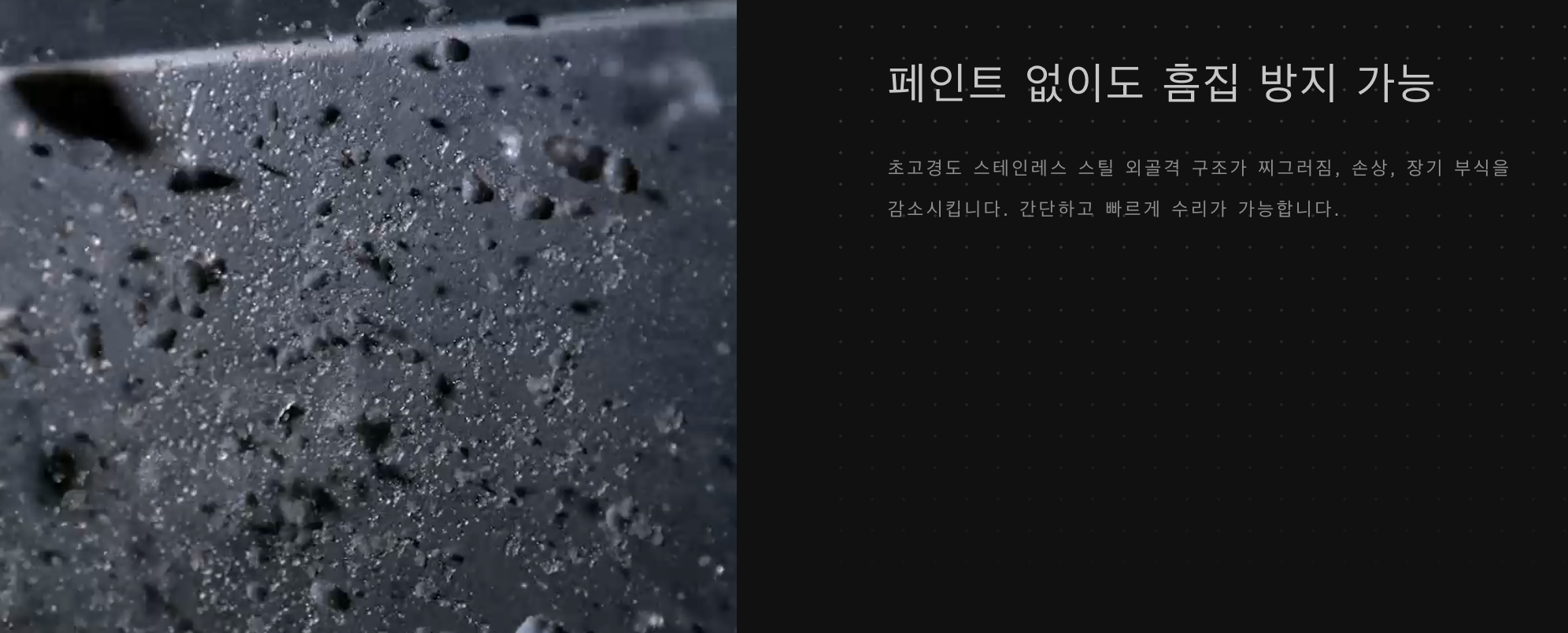 - 초경량 301 스테인리스 스틸 외장 및 엑소스켈레톤 구조로 내구성 및 충격 저항성이 뛰어남