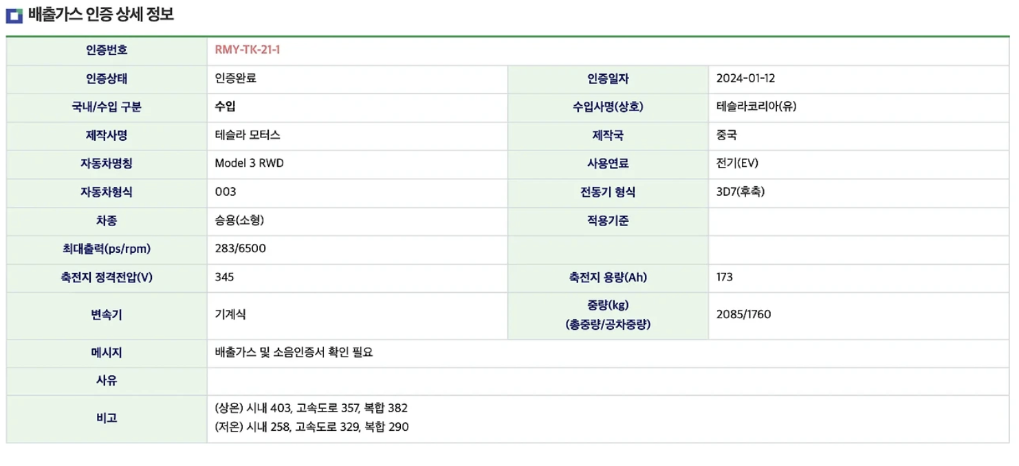 테슬라 모델 3 하이랜드는 환경부의 주행거리 및 배출가스, 소음 인증을 완료했습니다. 인증을 통해 주행거리, 배터리, 출력 등의 기본 정보를 확인할 수 있습니다.