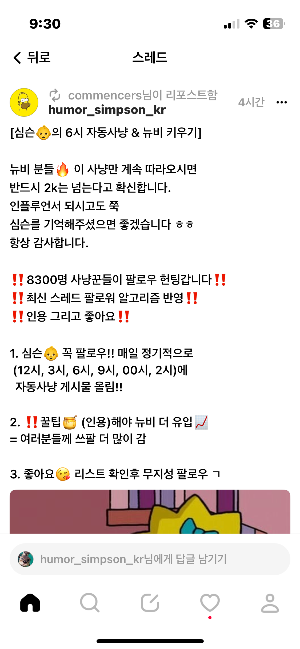 스레드의 알고리즘은 또 바뀌겠지만 현재까지는 공유와 인용이 많이 된 게시글이 무작위로 뜹니다. 이 기능 때문에 쓰레드 열차를 타고 팔로우를 나눔하는 문화도 있습니다. 알고리즘 덕분에 인용과 공유 리포스트가 많이 된 글은 다른 분들 피드에도 잘 뜨기 때문이죠.