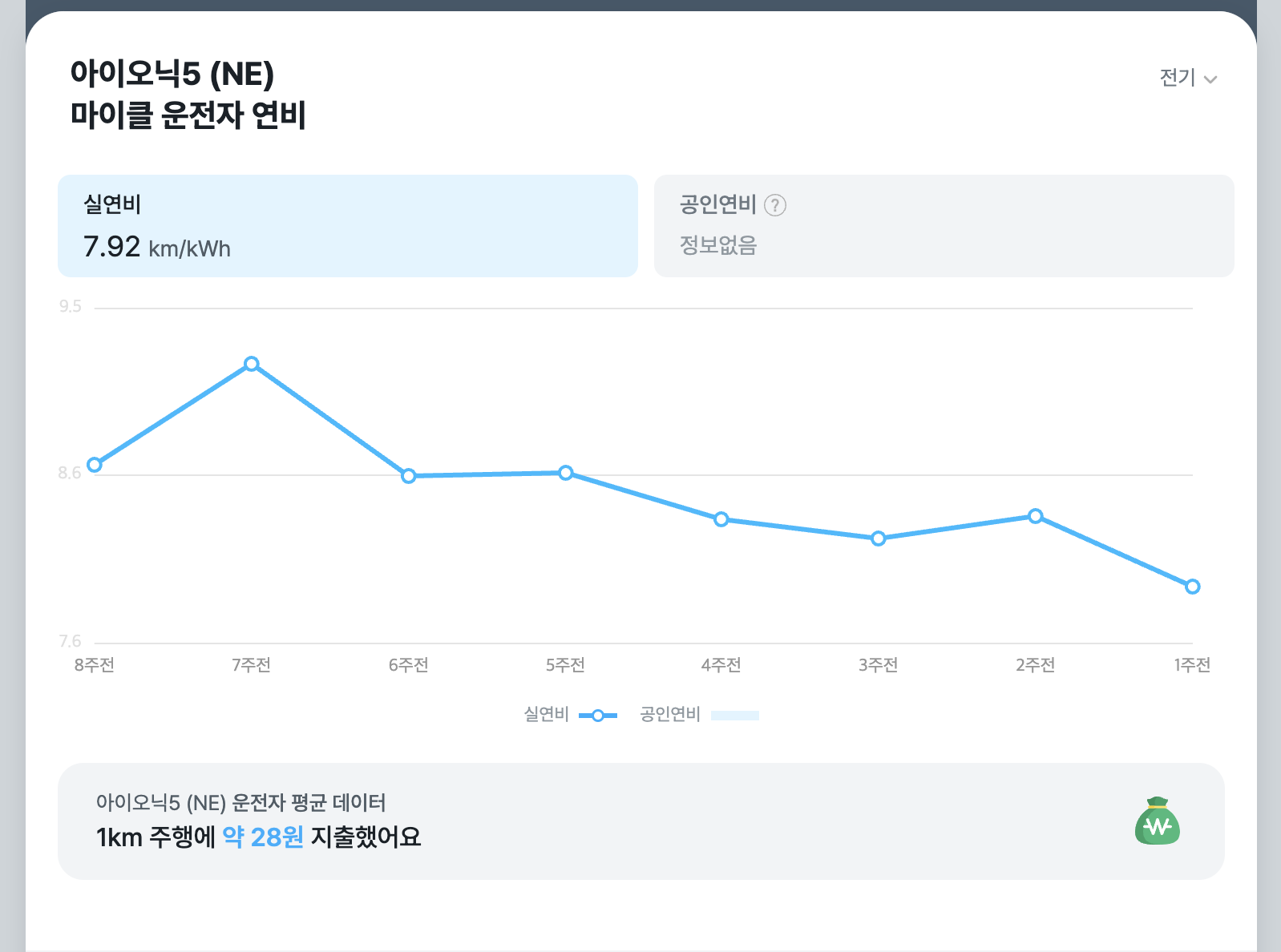 - 운전자 실연비: 아이오닉 일렉트릭 모델의 평균 실연비는 6.67 km/kWh로 보고되었습니다. 이는 공인 연비인 6.3 km/kWh를 상회하는 수치로, 실제 주행에서도 뛰어난 효율성을 보여줍니다.