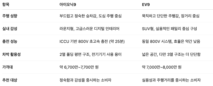EV9은 '실용성과 주행성 중심의 전기 SUV'로 포지셔닝되어 있어 가족용, 장거리 주행 위주 운전자에게 적합합니다. 반면 아이오닉9은 정숙한 주행감, 감성적인 실내, 최신 ICCU 기술을 모두 갖춘 모델로, 도심형 럭셔리 SUV에 더 가깝습니다.