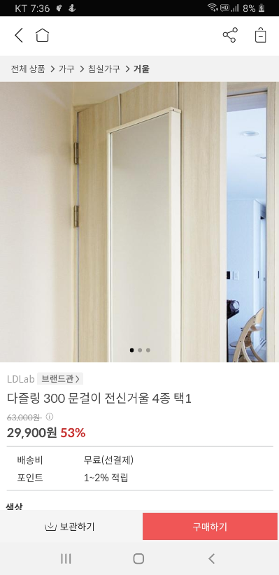 랜딩페이지가 매력없음. 전신거울 글귀 보고 들어갔지만 저 제품 하나만 봐서는 아무 흥미 없음. 바로 이탈.