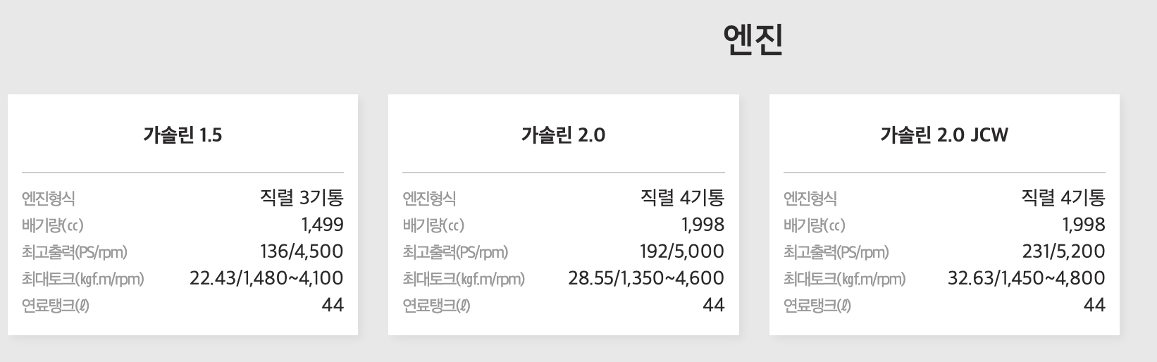 이 차량은 1.5 가솔린 모델과 2.0 모델로 구분되며, 전자는 3기통 엔진에 최고출력 136마력을, 후자는 4기통 에서 최대 192마력(S 모델), JCW는 231마력과 자동 8단 미션을 자랑합니다.