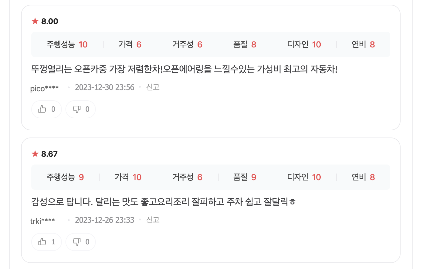 - 실 사용자 연비: 실제 운전자 데이터를 기반으로 한 평균 연비는 10.58 km/L로 나타났습니다.