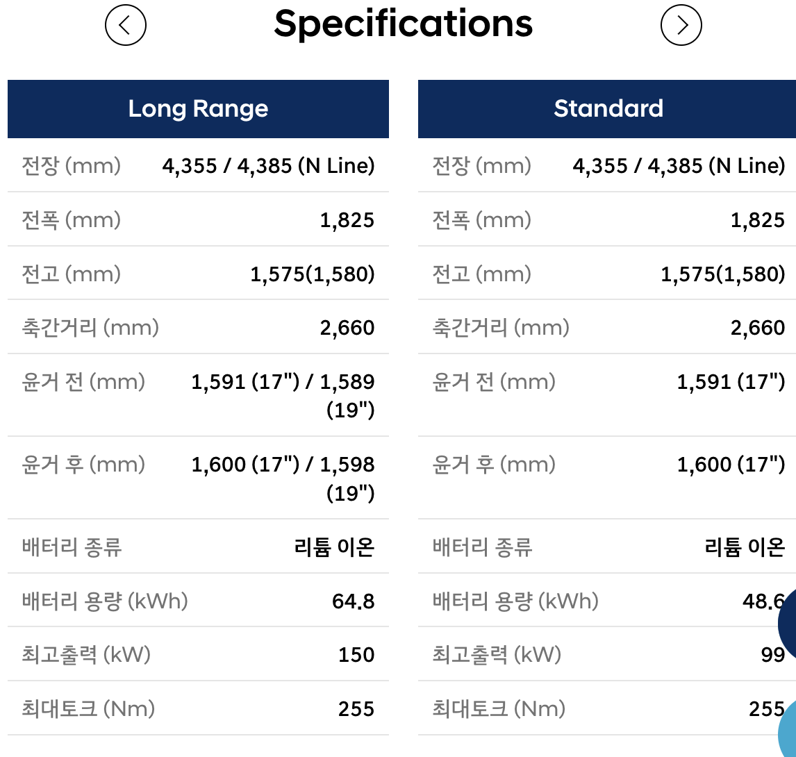 - 배터리 및 주행거리: 코나 일렉트릭은 64.8kWh 리튬이온 배터리를 탑재하며, 이를 통해 뛰어난 주행거리를 제공합니다.