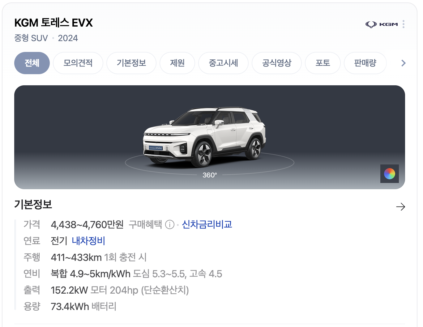 - 가격 정보: 토레스 EVX는 4,438만 원부터 시작하며, 배터리 용량은 73.4kWh, 총 주행거리는 411~433km입니다.