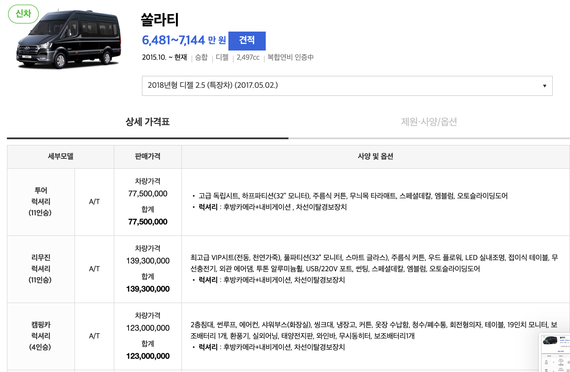 - 11인승 투어 럭셔리 모델: 77,500,000원