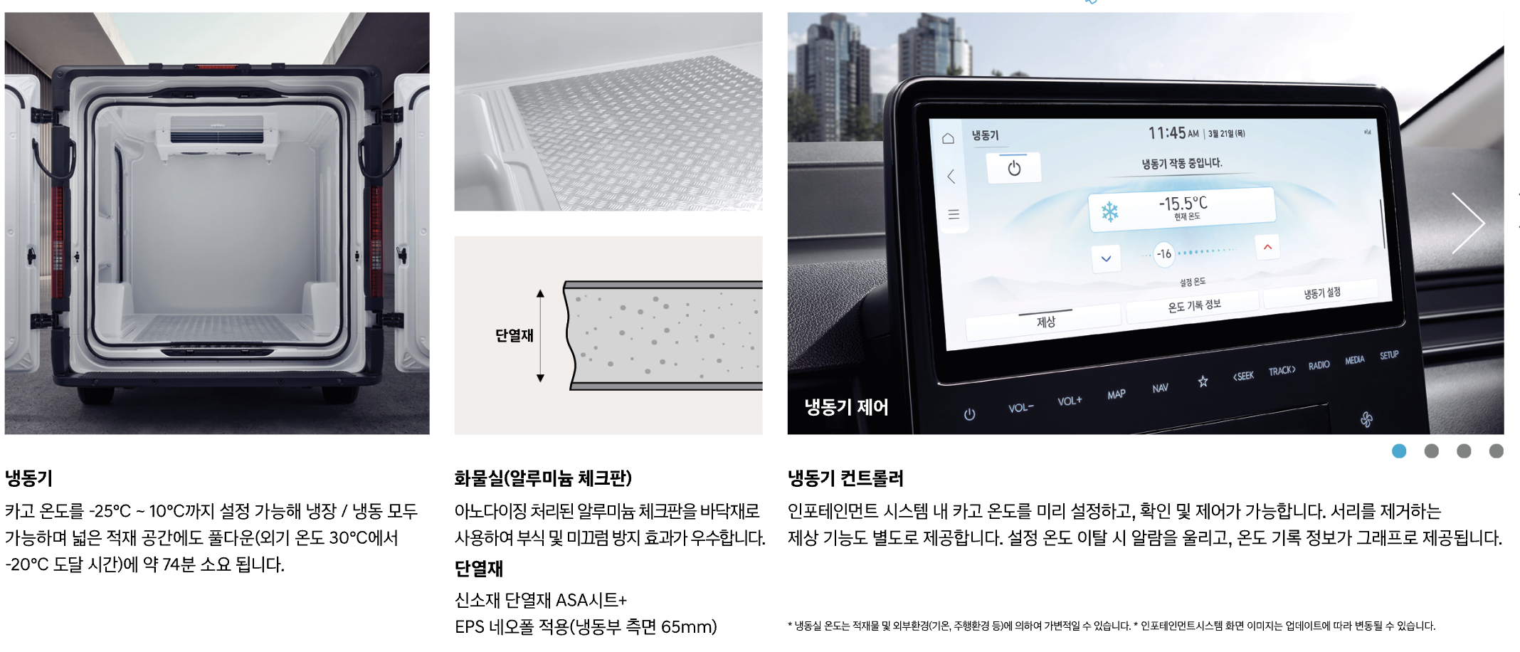 - 화물칸 온도 조절 범위: -25℃ ~ 10℃, 약 74분 내 -20℃ 도달 가능