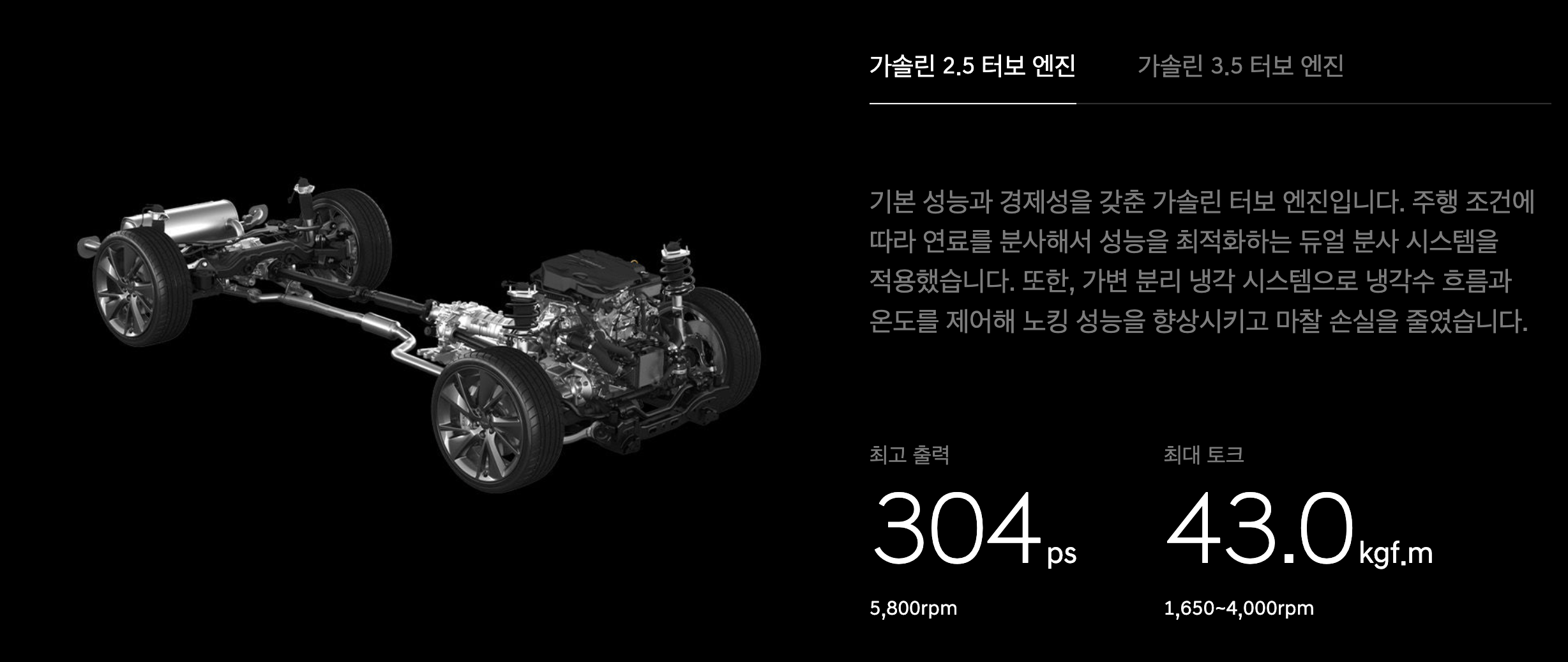 - 2.5 터보 및 3.5 터보 가솔린 엔진 옵션이 제공됩니다.